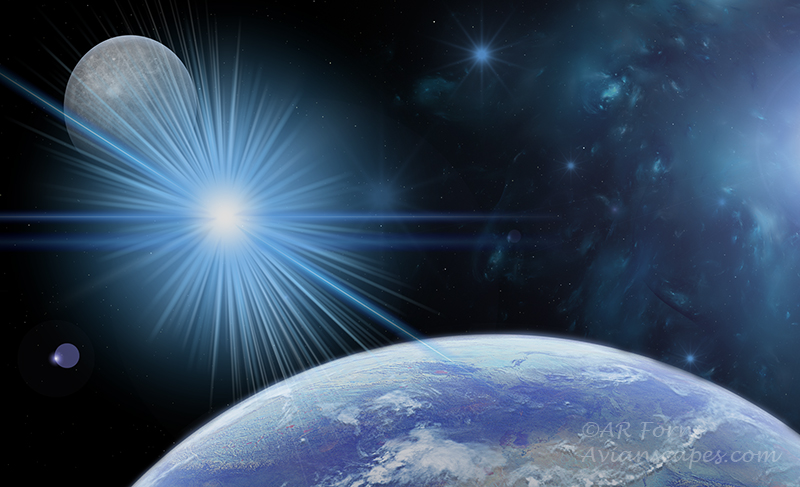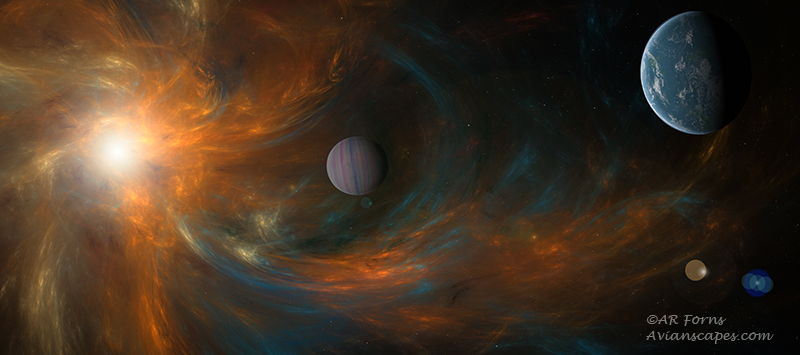 Alfred and I discovered space art, thanks to Gary Briney, NSN digital art moderator, and have taken it seriously. We have been using a PS plugin called “Cosmic pack 2, from UK based Digital Heaven. A moderate learning curve and lots of fun and relaxation. Tutorials are available on their website and they come included in the download.