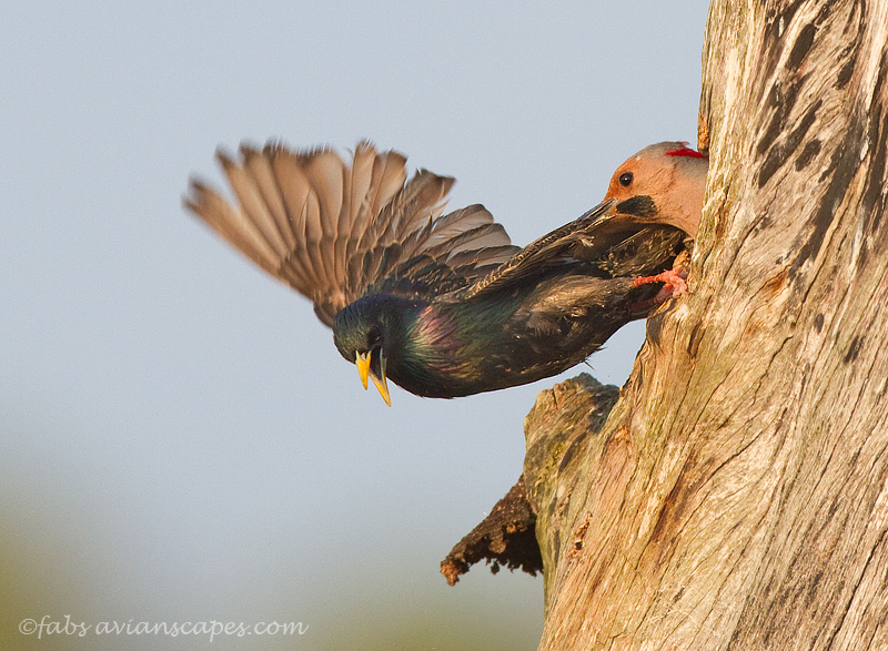 Starlings are not endemic to the States and were introduced here in the late 1800s by a Shakespeare fan who wanted every species mention in the Bards works to be here. Today, there are millions of them, considered a nuisance by cattle operations and aviation, and they pose a threat to many cavity nesters. We were witness to the latter.