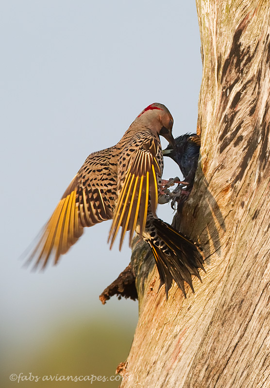 Earlier this year, our friend Judy Lynn called us shot of breath and very excited, that there were a pair of Flickers being chased out of their brand new nest by a gang of Starlings. We happen to have the afternoon off and we headed to Green Cay Wetlands, and joined Judy and a couple more photographers. Everything seemed calmed at the moment, but as the afternoon progressed, we could see the Starlings gang up and look and conspire to see which one would attack first.