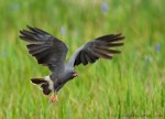Male Kite flying in field of flowers.