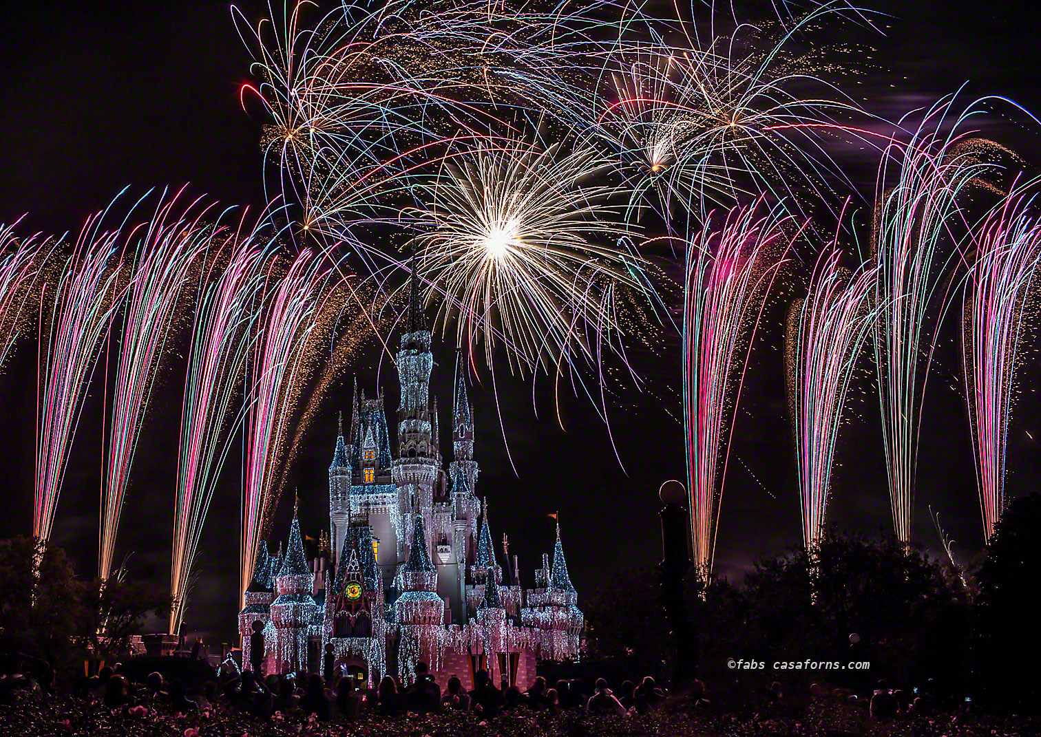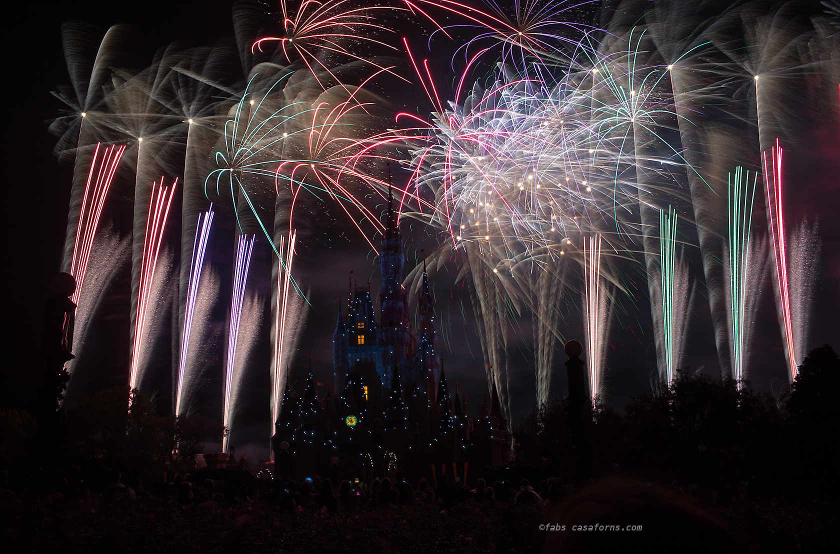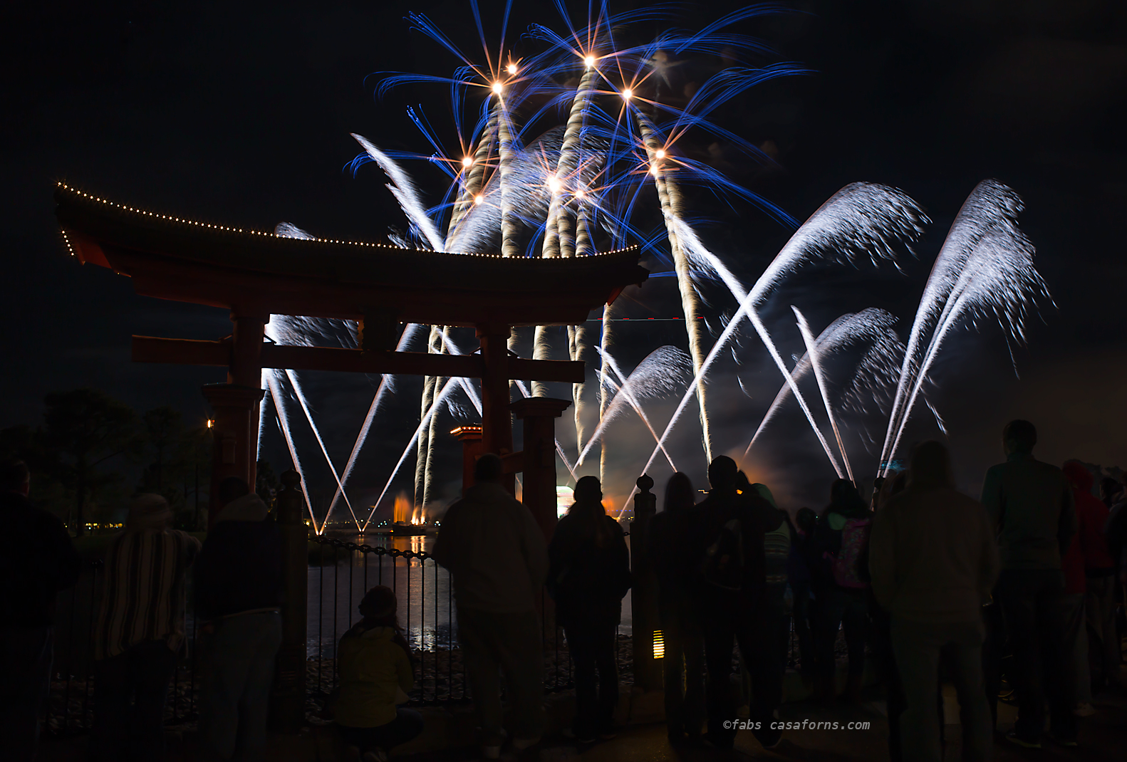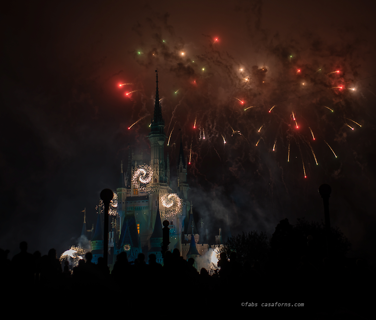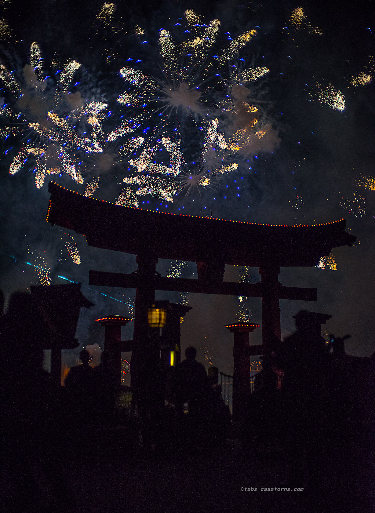 I set the camera to Aperture Priority, Auto ISO, f/4 and -1 Ev compensation, to avoid burning the white lights. Normally, at the end of every show, the intensity of the fireworks is much bigger than before and many times a lot lighter, so it is a good idea to move your aperture to a smaller one or your shutter speed to a quicker one, and you have more chances of getting a better exposure.